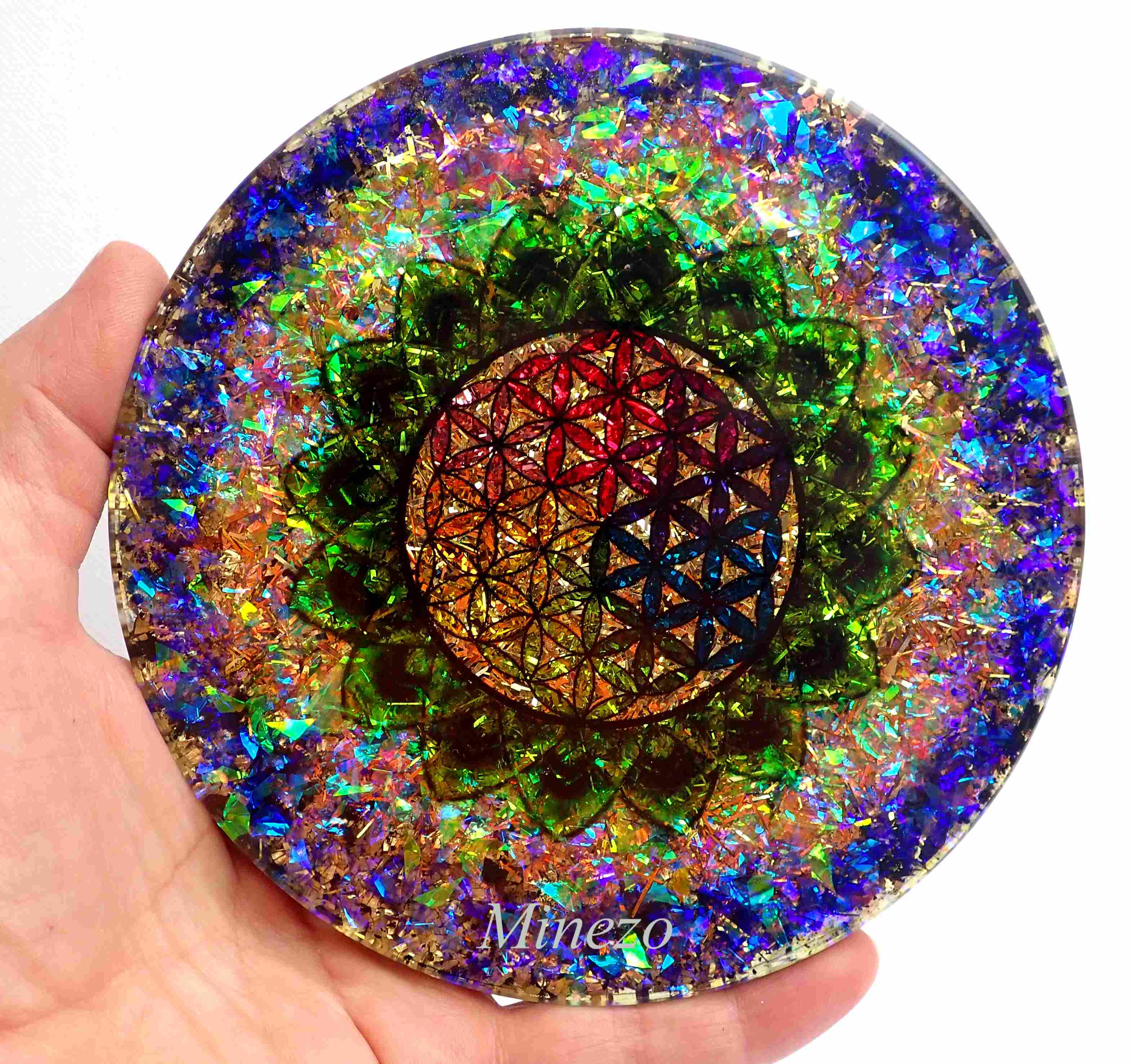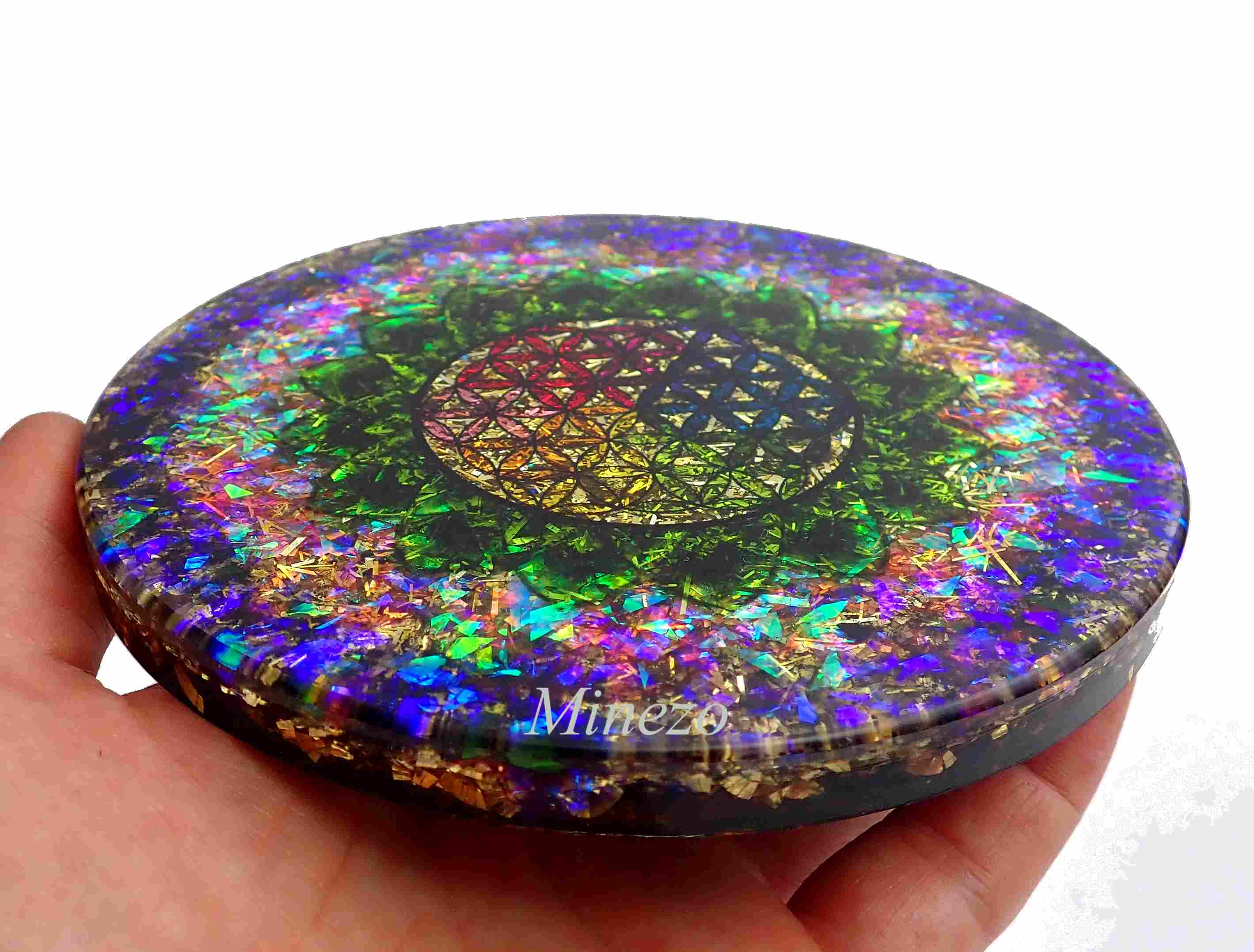 Orgonit obsahuje: kvet života, mandalu, šupinky s nanovrstvou titánu, glitre, mosadzné špony, krištáľ, šungit, medenú špirálu, epoxidovú a smrekovú živicu.